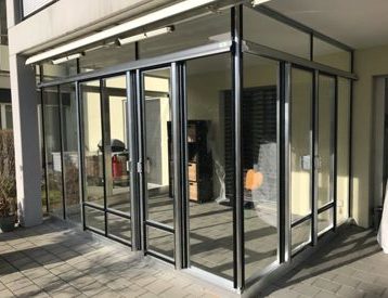 Stehwandverglasung mit 1 Schiebetüre, Profile Aluminium roh